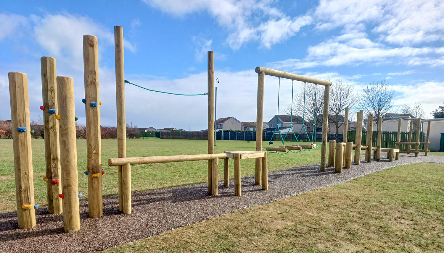“Carlogie Primary School’s existing outdoor play equipment had become outdated and was no longer functional, rendering it unavailable for use for several months. With the need for a new play structure, the school decided to invest in a modern timber trim trail to benefit their students and enhance the school grounds. With a set budget in mind, the school sought a solution that would provide long-term enjoyment for the children.