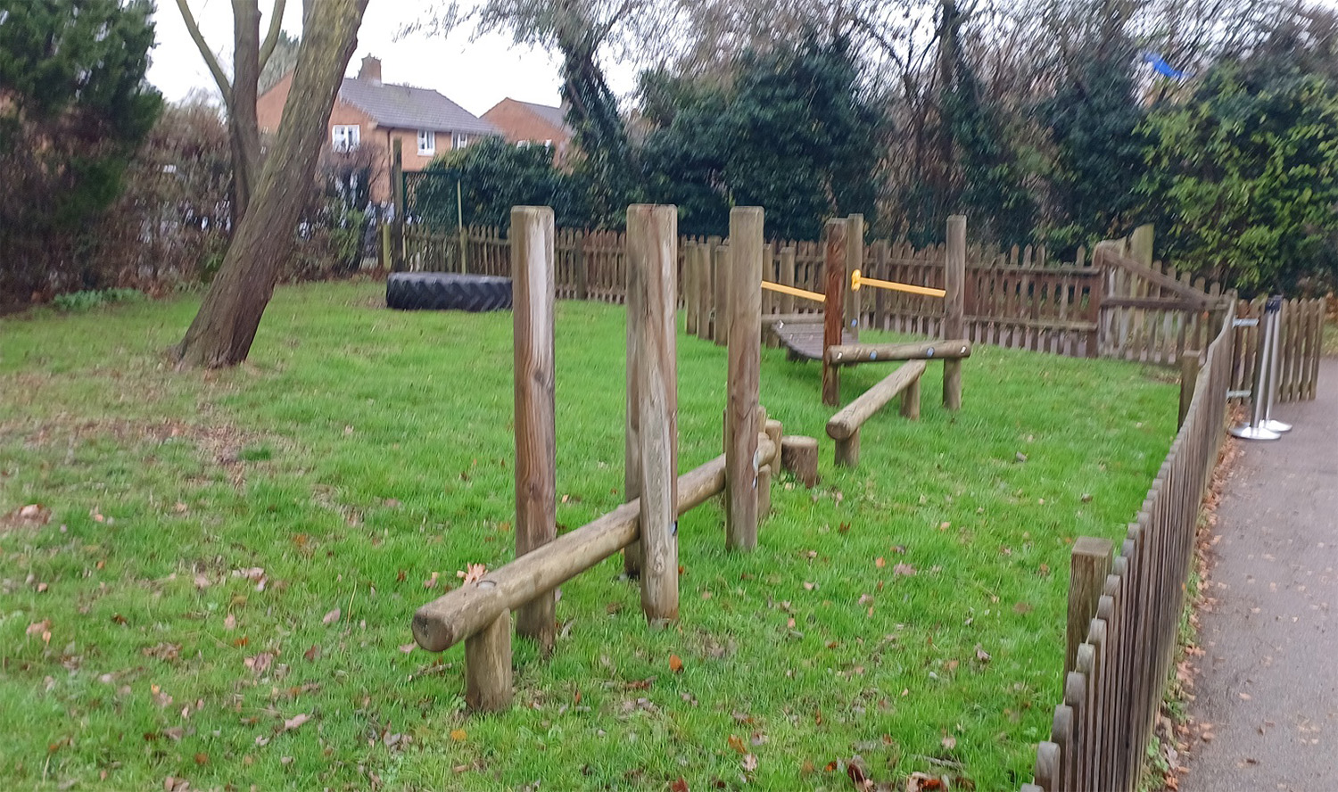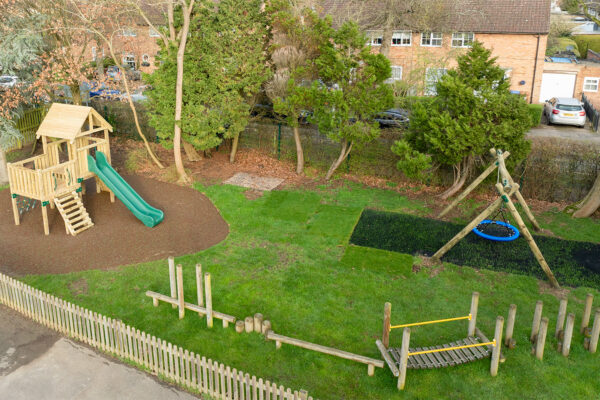 “The school chose to retain the existing trail but wanted to enhance the surrounding area. They decided on a custom adventure tower with rubber mulch safety surfacing, along with a basket seat swing installed on grass guard tiles, allowing multiple children to enjoy the equipment at the same time.”