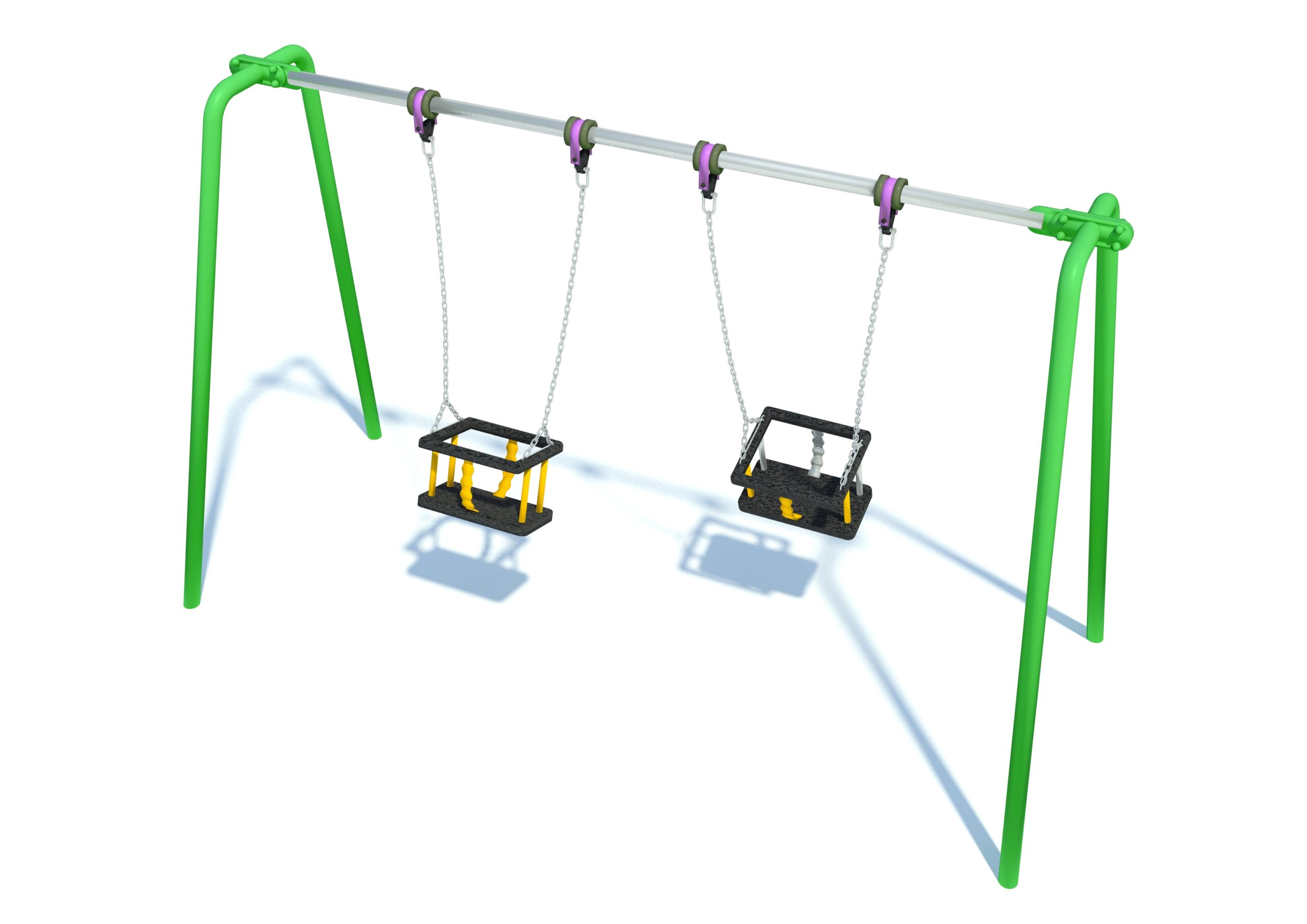 A simplistic swing with a full metal frame, tailored to younger years. This swing is complete with 2 cradle seats which are more easily supervised.