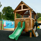The Buzz starts our range of large 1.5m x 1.5m decked tower units and comes complete with a slide, rock climber and log ramp. This range of tower units affords children the space to play on the decks as well as on the activities.